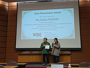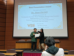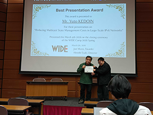 At the WIDE 2026 Spring Camp Meeting held in March 2026, poster presentations by Ms. Tanizaki Fumiya, Mr. Yuto Kedoin, and Mr. Shinri Okano from Nara Institute of Science and Technology were honored with awards.